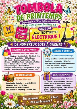 Par admin jean-baptiste-dumas-salindres, publié le jeudi 16 avril 2026 17:09 - Mis à jour le jeudi 16 avril 2026 17:23Le FSE du collège de Salindres organise une grande tombola de printemps au profit de tous les élèves ! 🎉 🎟️ 1€ le ticket 📅 Tirage au sort : 26 mai 2026 -