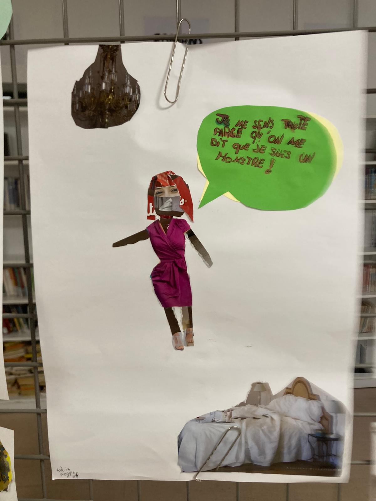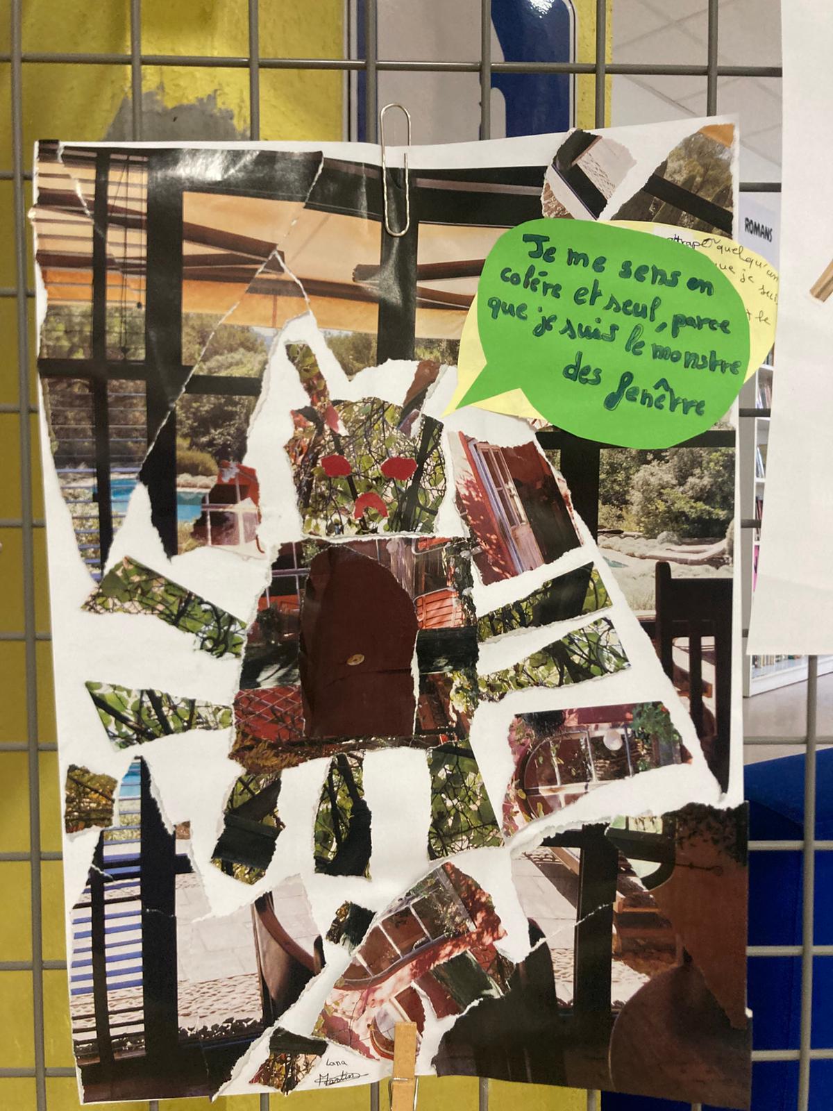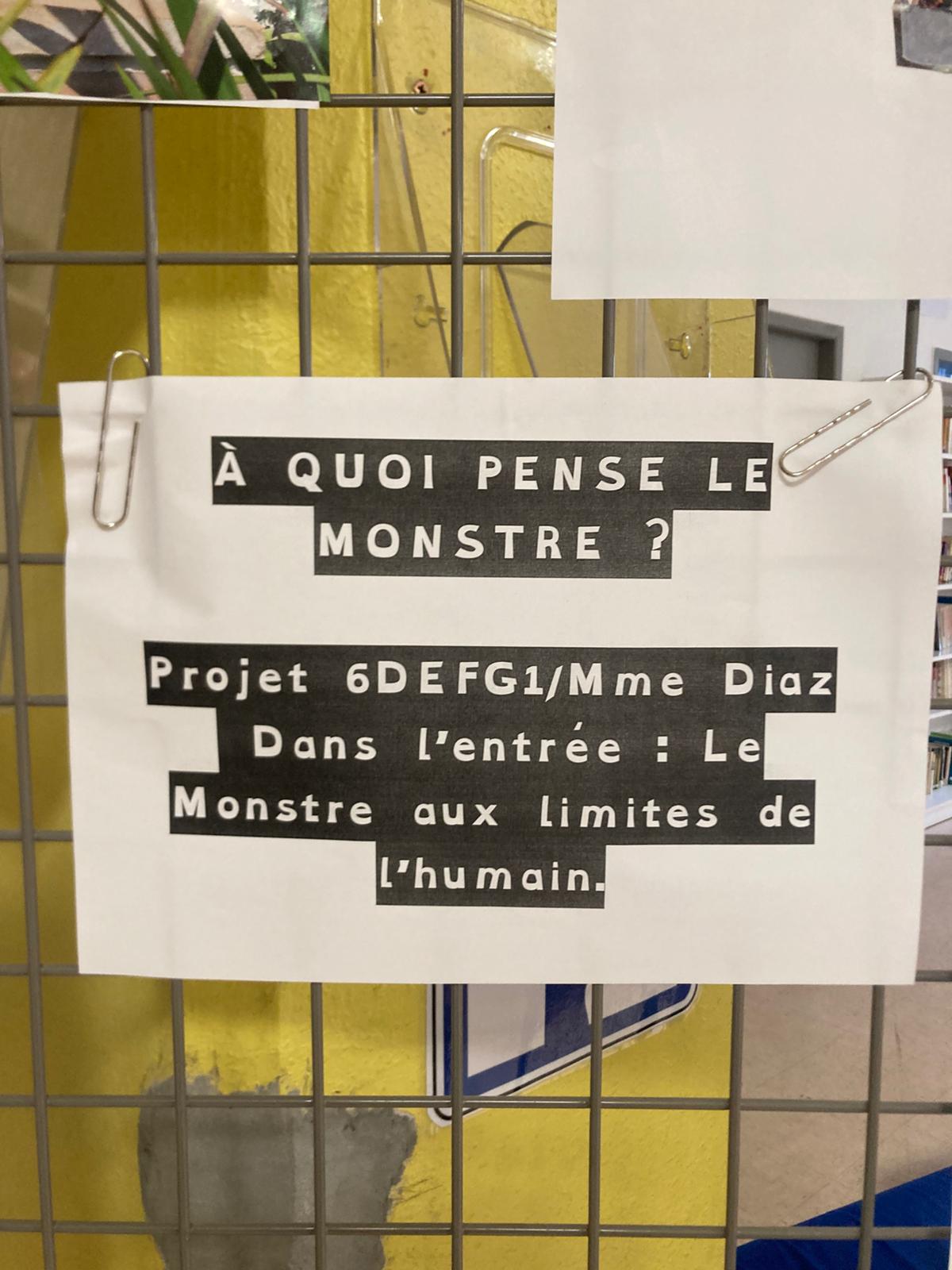 « Que pense le monstre? Après avoir étudié différentes figures de monstres, les élèves de 6emeDEFG1 ont fabriqué leur propre « monstre », en s’inspirant des textes lus et de leur imagination puis ils lui ont donné la parole en partageant la pensée du monstre, pour essayer de mieux le comprendre. »